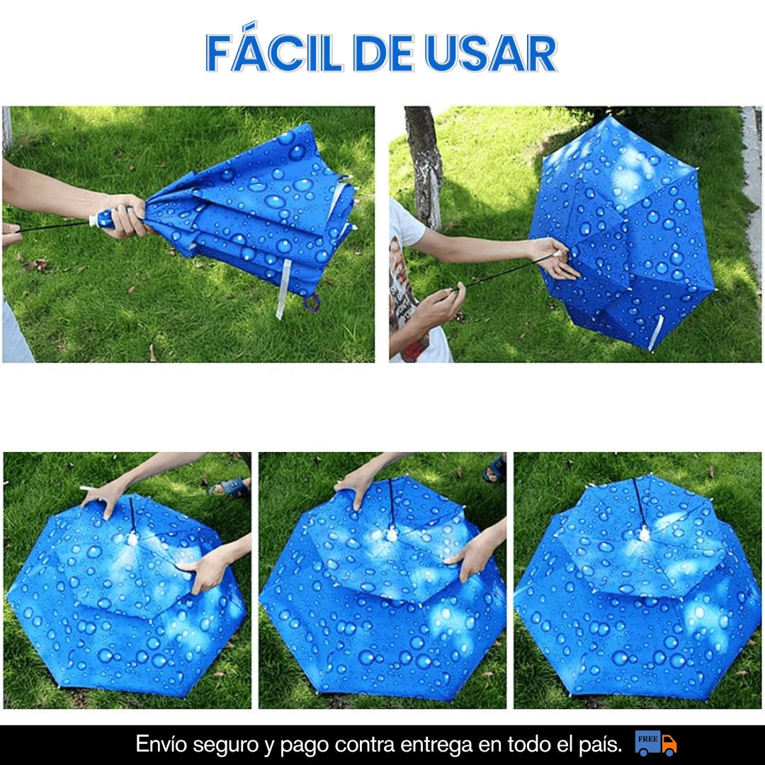 ✔ Olvídate de cargar con un paraguas tradicional. Se coloca cómodamente sobre tu cabeza, manteniendo tus manos libres para hacer lo que desees.